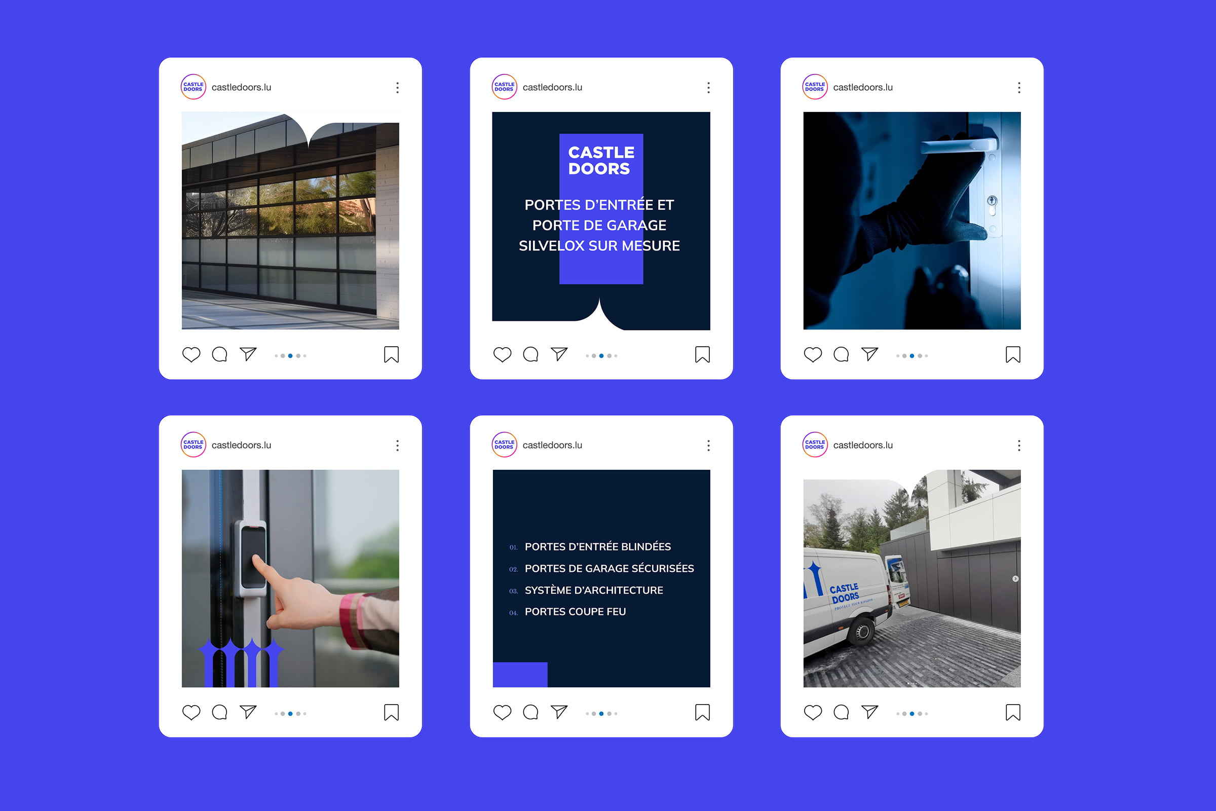 Sur les réseaux sociaux, la stratégie visuelle suit les codes établis, avec des contenus principalement centrés sur les produits. Des légendes informatives et une présentation professionnelle renforcent l’image de qualité de Castle Doors.