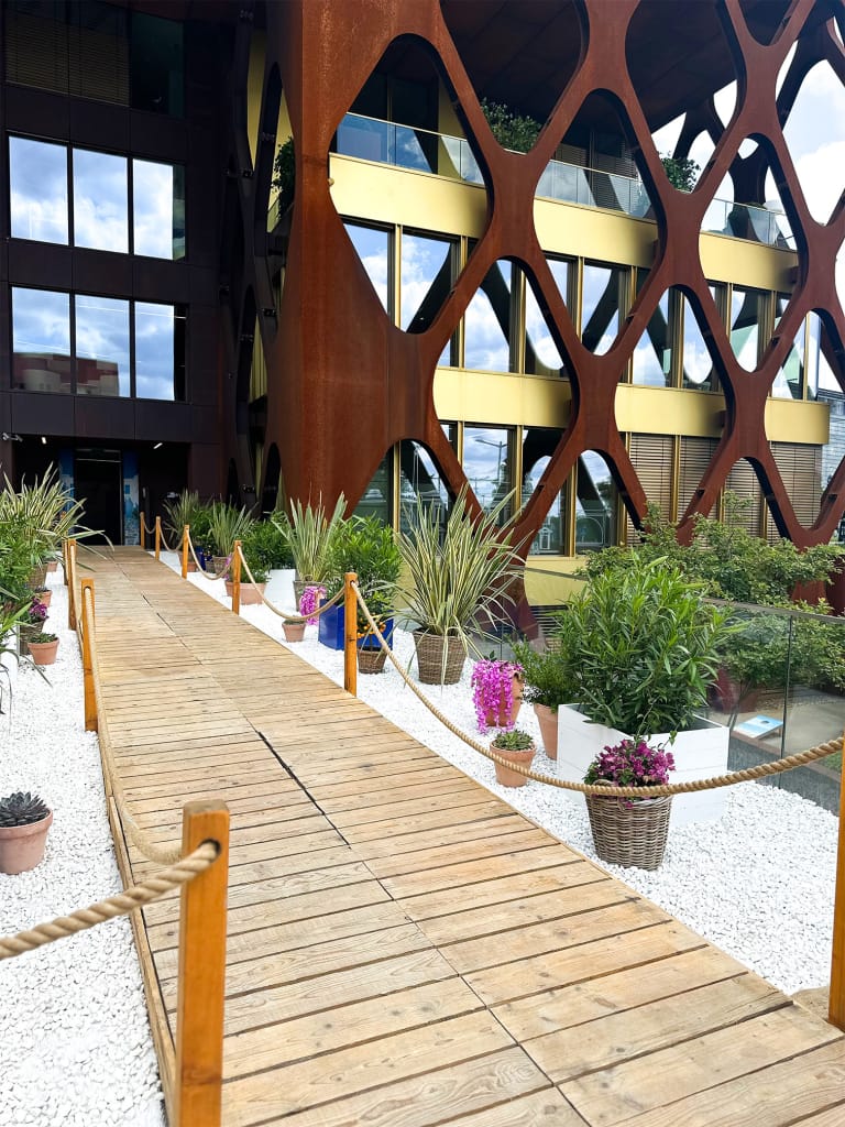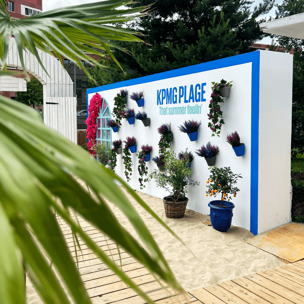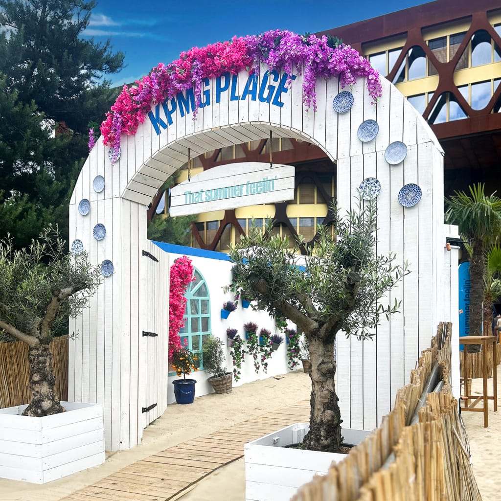 Au cœur de cette plage éphémère, oliviers, palmiers, lauriers roses et structures en bambou offraient un refuge dépaysant aux employés et visiteurs de KPMG, même face aux aléas du climat.
