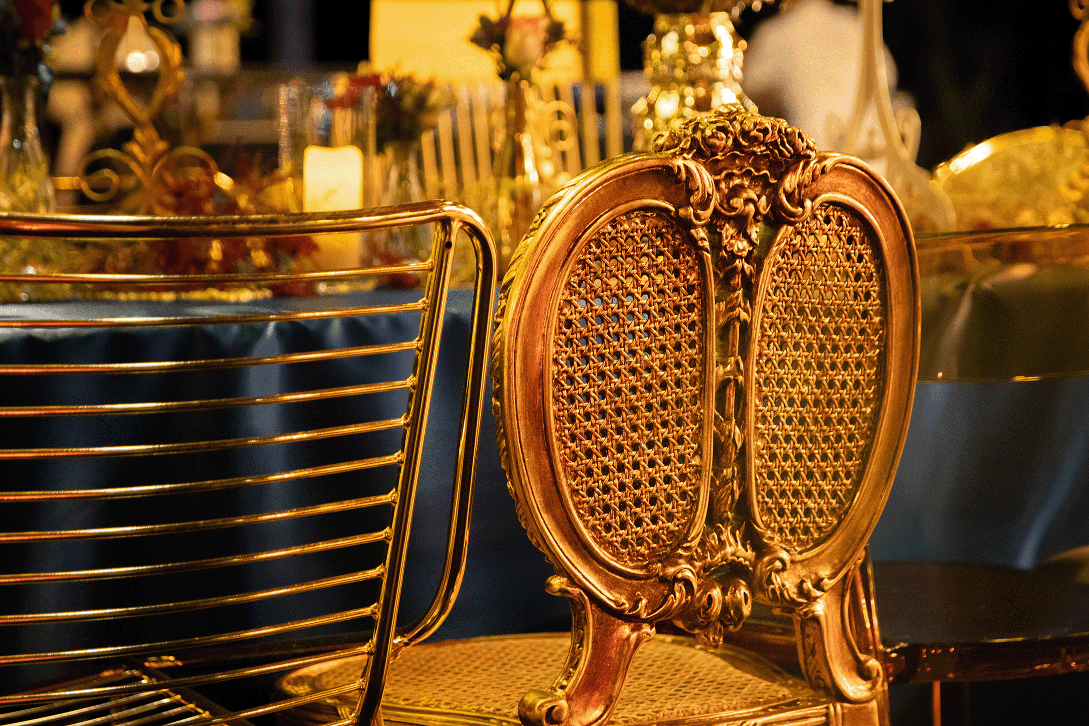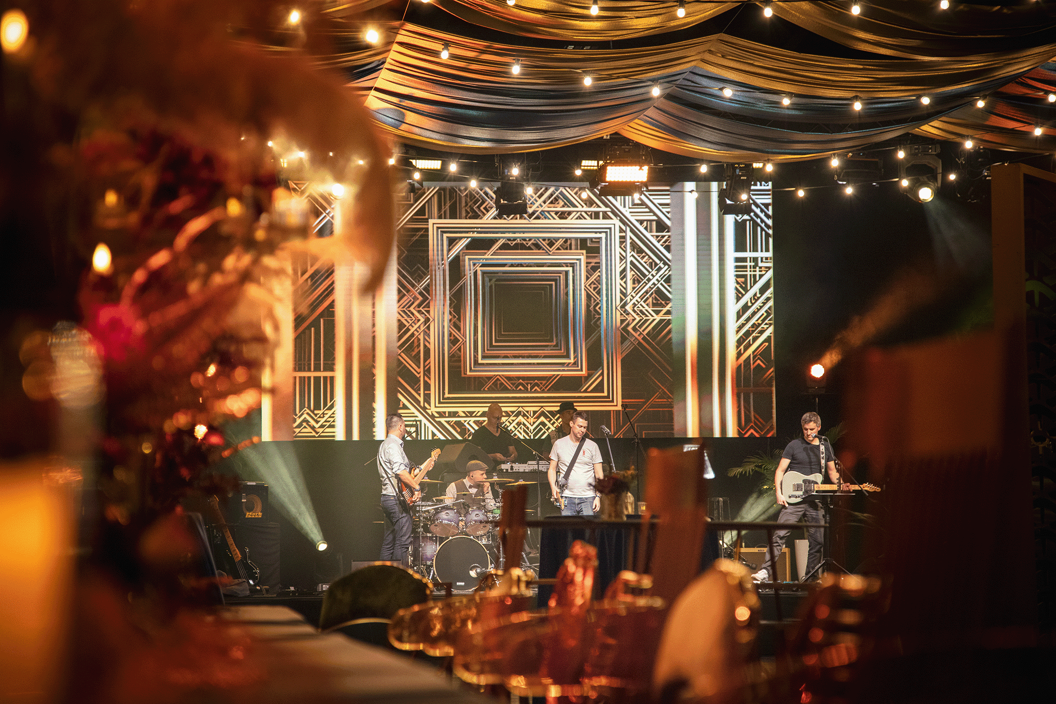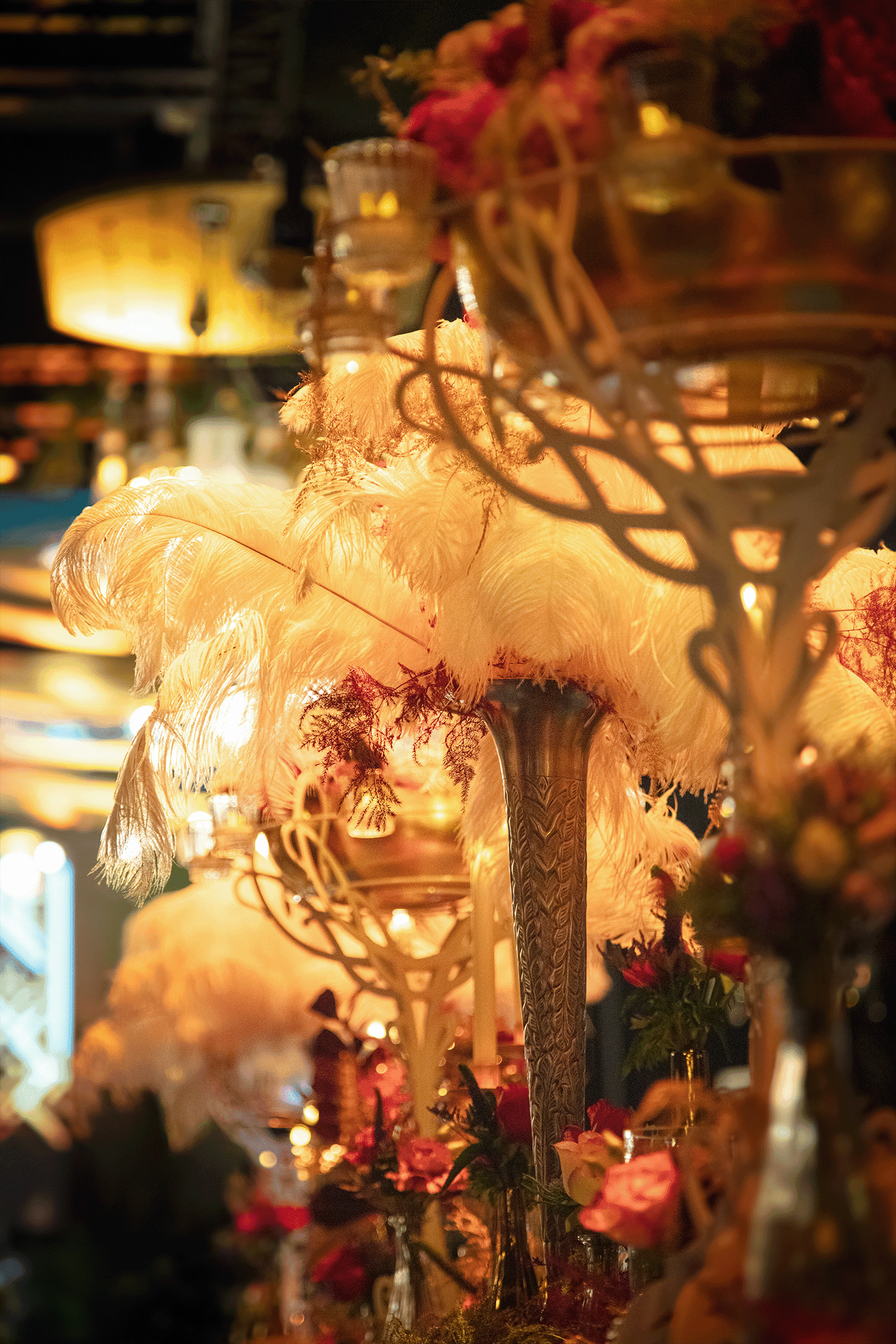 Dès leur arrivée, les invités ont été plongés dans une atmosphère hors du temps, accueillis par une voiture des années 50 trônant à l’entrée. À l’intérieur, la salle avait été entièrement métamorphosée : tables élégamment dressées, candélabres imposants, liseuses en velours et lustres majestueux ornés de fleurs et de cristaux composaient un décor spectaculaire. Lors de cet évènement, chaque détail avait été pensé pour recréer l’atmosphère feutrée et sophistiquée des plus grands cabarets.