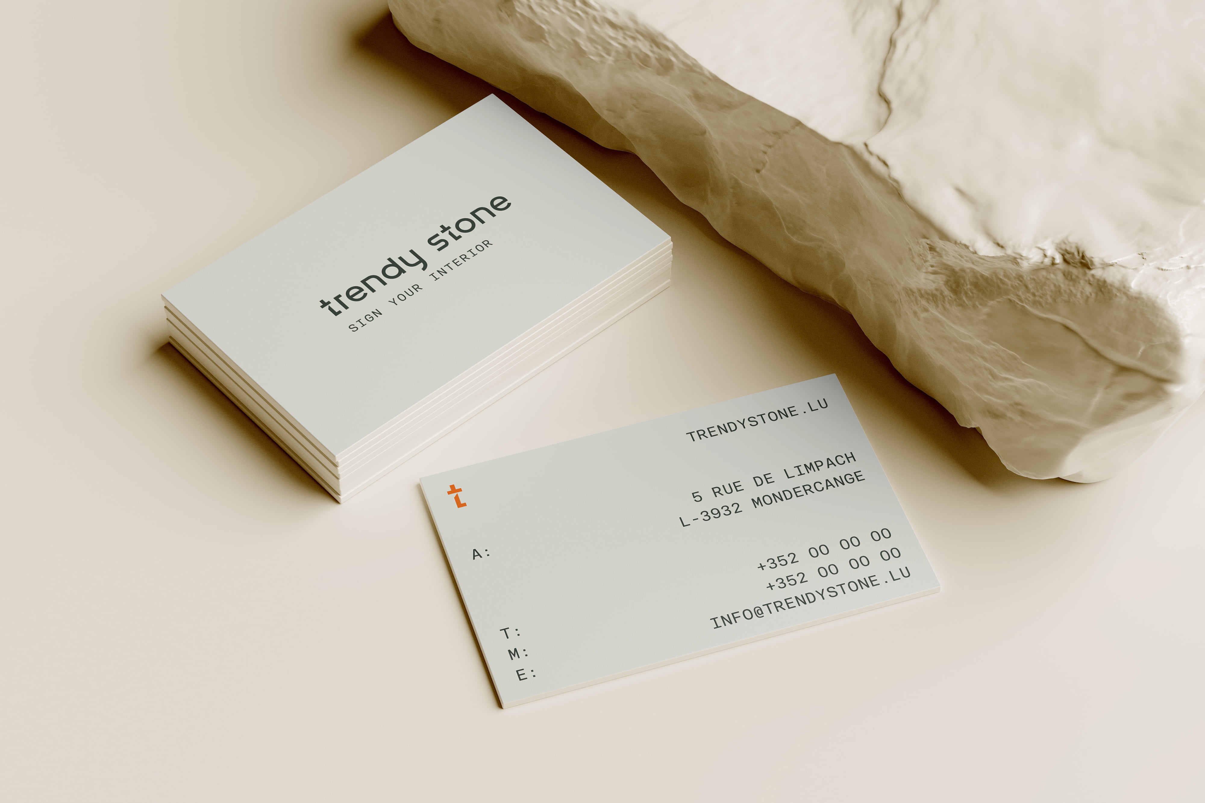 La charte graphique qui a été définie, reflétant les couleurs du secteur de l’activité de Trendy Stone, le sol de bâtiment à la fois brut et clair, a été déployée sur les cartes de visite et sur les annonces publicitaires.
