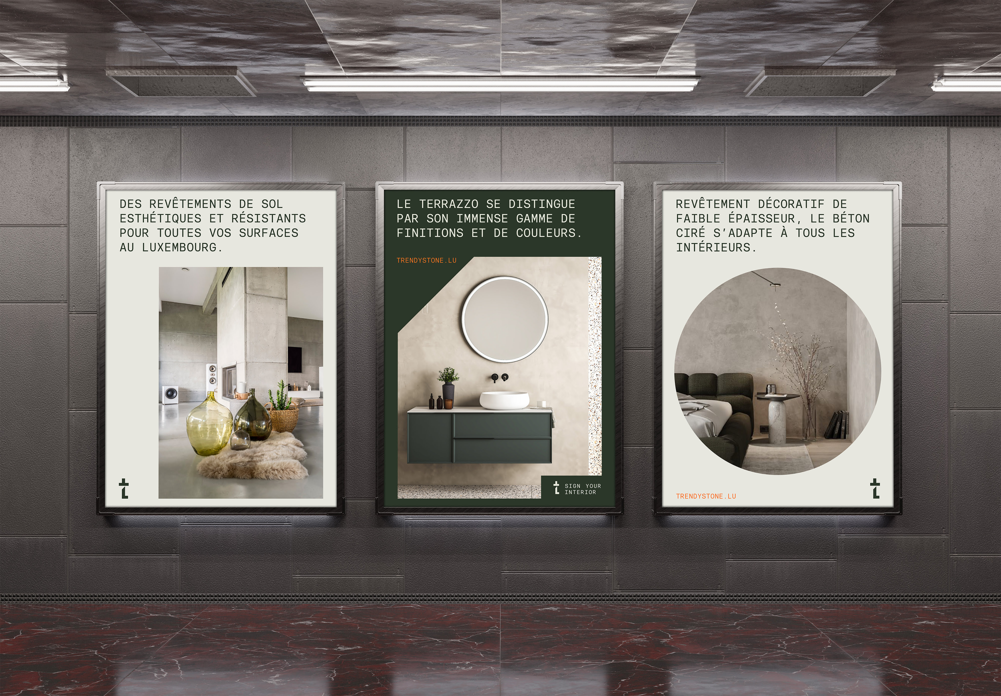 “Trendy Stone, sign your interior” a notamment été choisi comme « baseline », reflétant le choix audacieux et affirmé de l’utilisation du béton lissé pour sa décoration. C’en est suivie la création d’un logo typographique utilisant des angles et des césures.